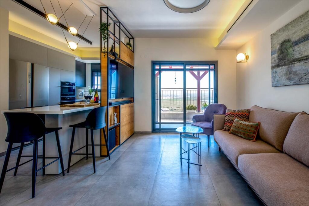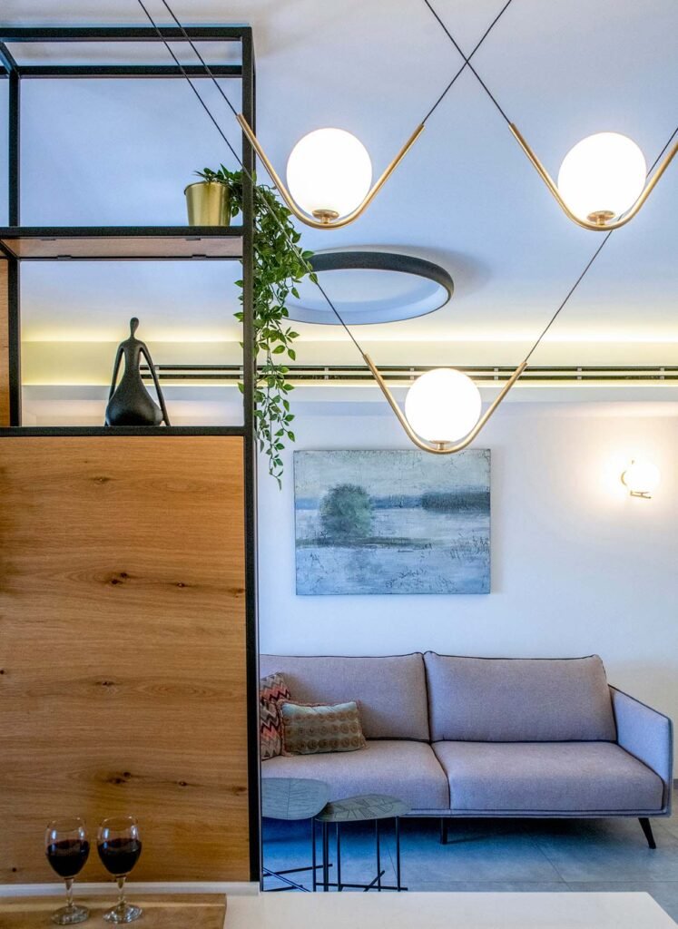 מיקמנו את "התכשיט" בלב הבית, קיר טלויזיה מעוצב ופונקציונלי בשילוב עץ וברזל המהווה הפרדה מושלמת בין הסלון למטבח.