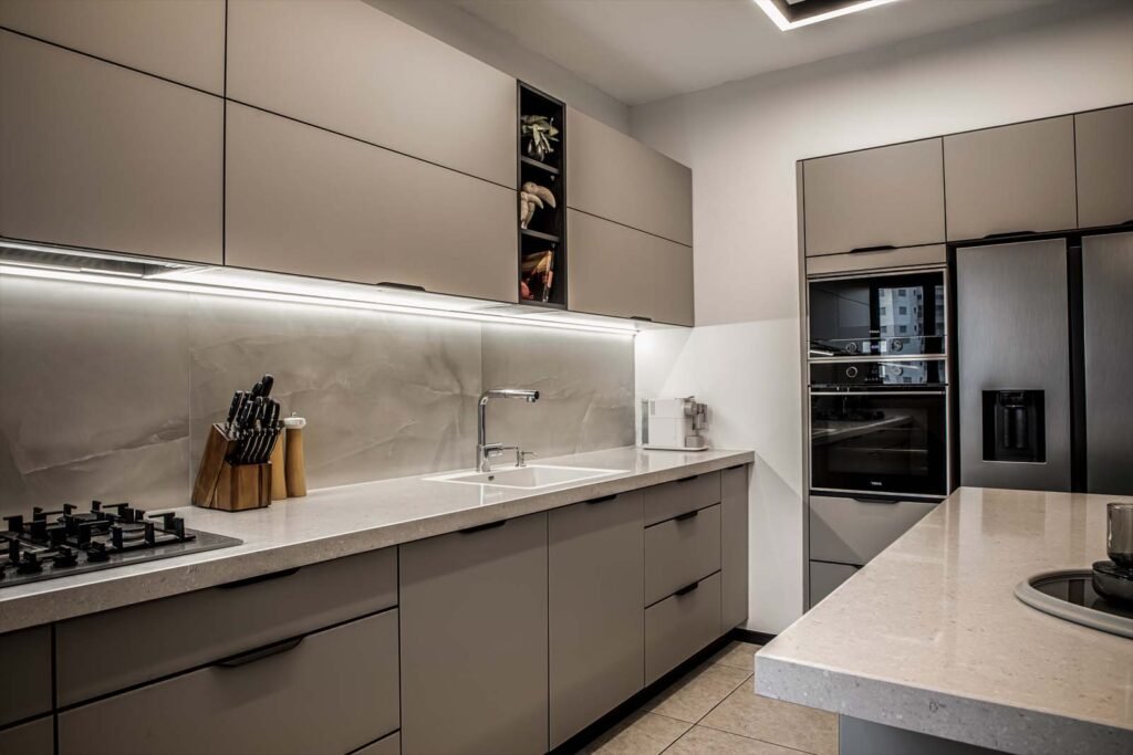 המטבח הלבן בקווים נקיים הוא באמת! לב הבית. ניצלנו כל פינה שבו באופן מקסימלי ועדיין השארנו אותו פתוח לחלל.